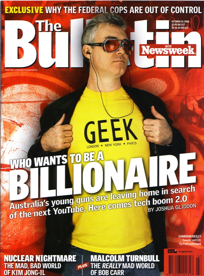 In November 2004, I co-created the first podcast recorded in Australia, “G’Day World”. This lead to being the co-founder of the first podcast business in the world – The Podcast Network. After my partner, Mick Stanic (RIP) left the business in 2005, I built it up and ran it for the next 3 years. At our peak in early 2008, we were producing over 1000 hours a month of audio, video and website content for a global audience of 500,000 people and managing the output of 100 worldwide contractors. When the GFC ramped up in late 2008, our advertising revenue disappeared almost overnight and I was forced to shut the business down. However, I re-booted it again in 2013 with a new business model. Back in the mid-2000s I got a fair bit of media coverage. This is me on the front cover of a now-defunct business magazine.