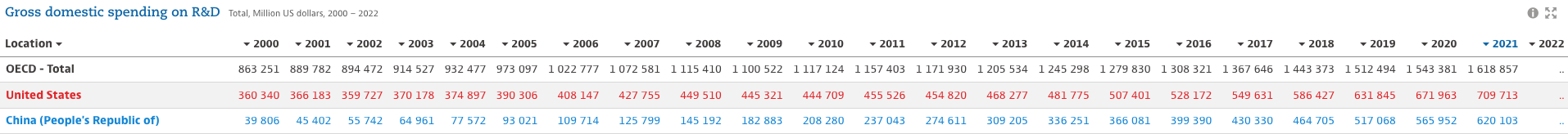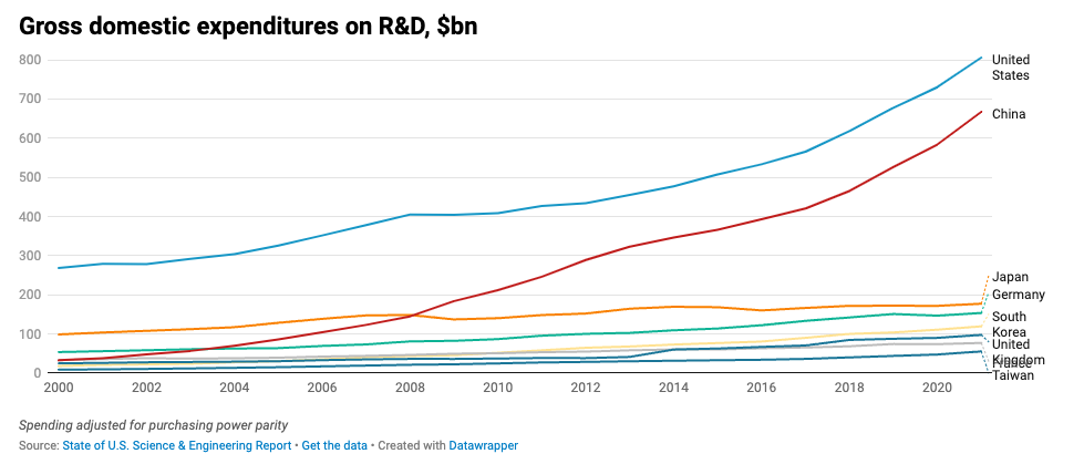 If you want to understand why the USA is terrified of China, trying to slow it down with a trade war and banning it’s social media apps, it has less to do with “national security” and mostly to do with R&D expenditure. Have a look at the way China’s R&D has grown in the last 20 years. In 2000, their R&D was about 1/10 of the USA’s. Today, they have nearly caught up (although private R&D in the US continues to keep them ahead). And there are no signs of China slowing down, either, with a goal of a 10% YoY increase declared at the latest “Two Sessions“.